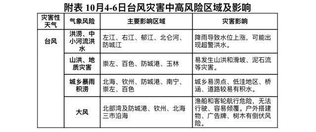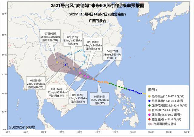气象部门提醒,台风“麦德姆”具有在南海移速快、增强迅速的特点,可能于10月5日登陆后继续西移进入北部湾海面。受其影响,5日、6日,北部湾海面、桂南、桂西和越南北部将有强风雨天气。此外,当前左江、右江、郁江等流域水位高,桂西、桂南土壤湿度大,此次台风降水落区与前期强降雨重叠,上游来水和本地降水重叠,灾害风险高。