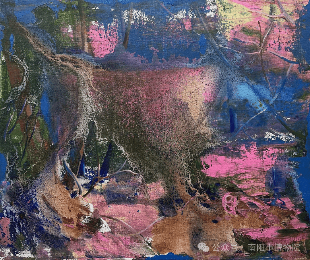 展览作品中,多幅以南阳地标为表达对象的作品尤为引人期待。尹朝阳以混合媒材重新解构南阳的名胜风景,将传统石刻的刚劲线条与丙烯泼洒的流动感并置,既是对汉代雄浑的艺术精神的致敬,亦是对现代化进程中文化断裂的隐喻。这种“在地性”创作,既是对家乡文化遗产的当代转译,也延续了他“将身体作为探测器投入自然”的创作哲学。