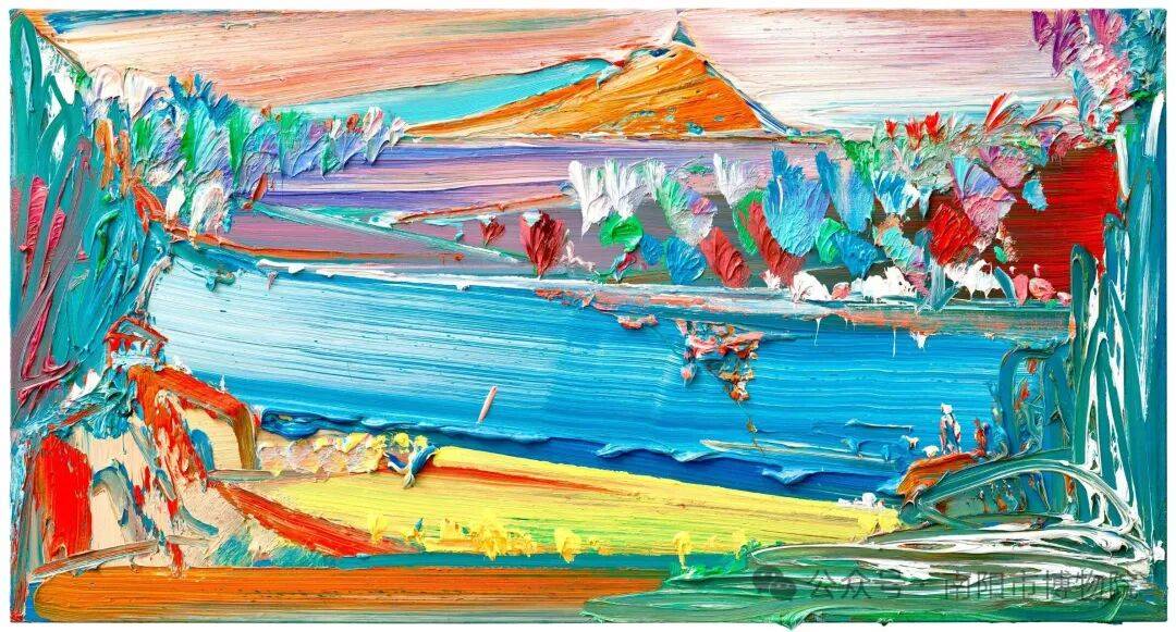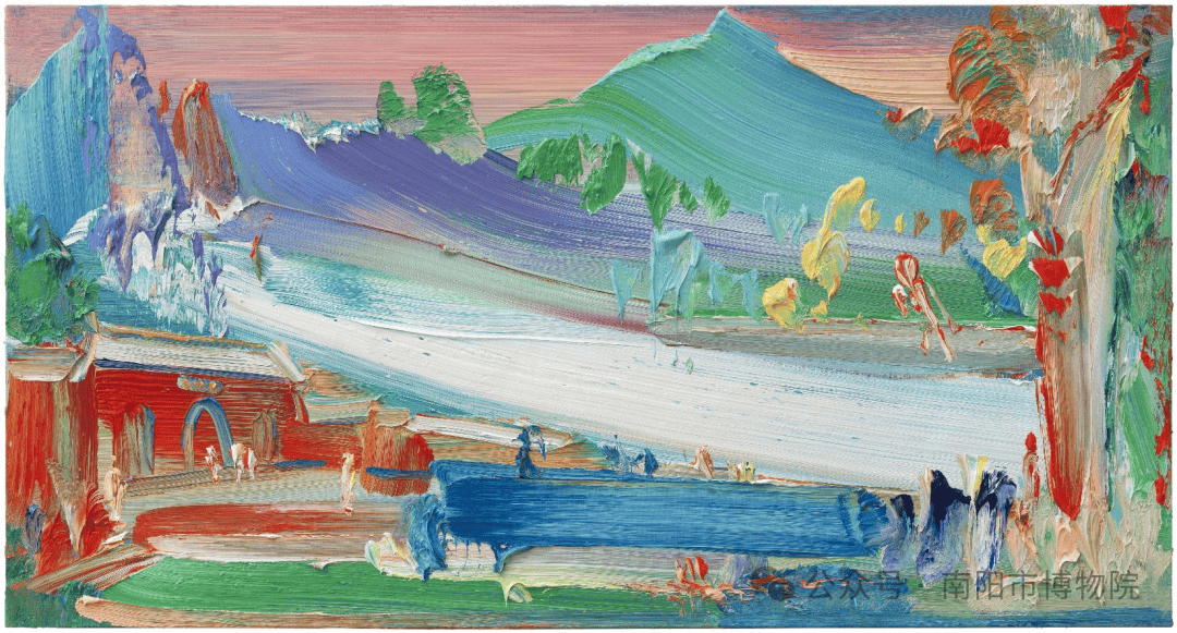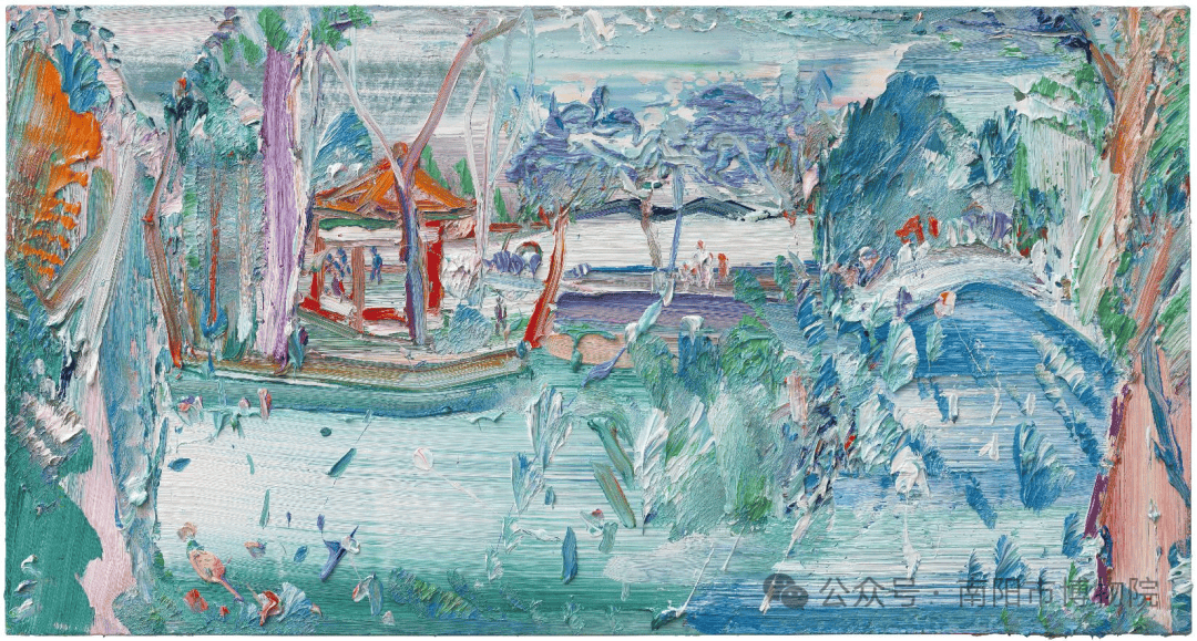 尹朝阳曾多次返乡写生,南阳的山川地貌成为其“心灵风景”美学的原始土壤。与塞尚对故乡圣维克多山的深情描绘不同,从人物画转向风景的尹朝阳,并没有把故乡的风景作为表达的具体对象。与他而言,山水风景只是抒情达意的物质形态,不会因为某种固定的形式束缚自我,包括画中形象的选择。但尹朝阳在《生于南阳》展览作品中,通过对独山、白河、南阳人民公园、卧龙岗等标志性景观的艺术描绘,完成了一场对南阳场域的物质性建构,这些地标不仅是地理空间的坐标点,更是凝聚了集体记忆与文化象征的意义符码。独山、白河、南阳公园等对他来说是记忆、现实、精神的重合,对这些符号进行重新编码,让记忆与现实展开对话。记忆是一种时间和空间的现实,并不只是单向度的时间切片。事件、人物、空间的叠合才是深层的记忆重现。