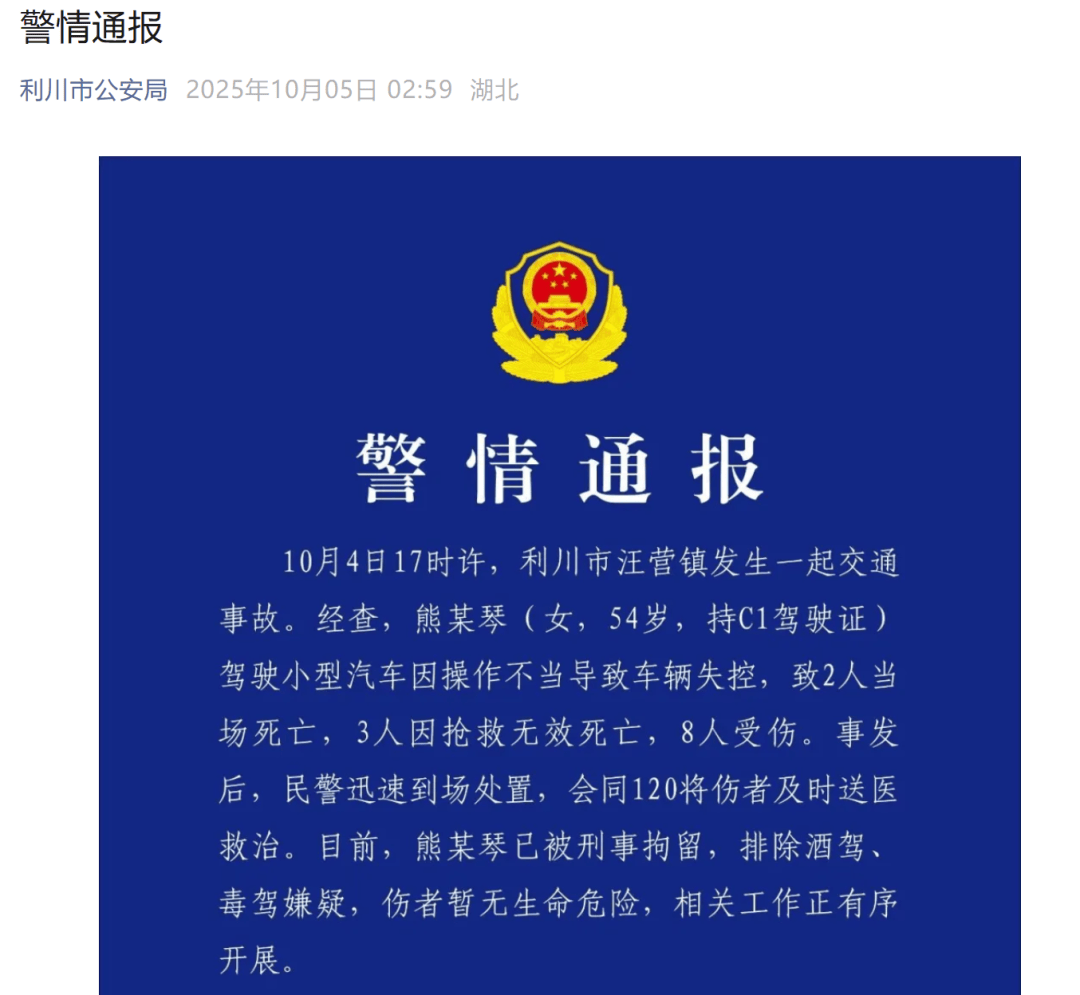 湖北警方凌晨通报:熊某琴(女,54岁)被刑拘,其驾车操作不当,致5死8伤
