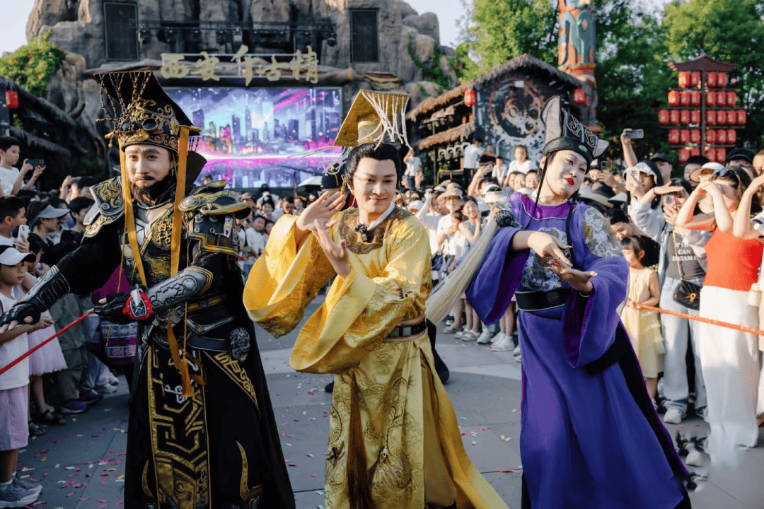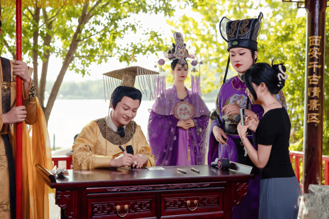 在西安,“李世民”骑着摩托车载着“秦始皇”,若去的巧,甚至能见到“三皇共舞”大场面。游客喊一声“参加皇上”,他立刻“封官加爵”:男的封将军,女的封郡主。玩得开心,还附赠一个身旁的“公公”,互动氛围过于热闹。