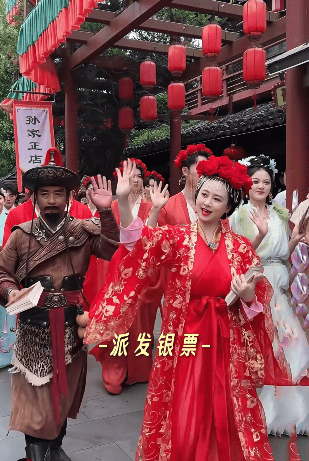 不得不说,演员的优势在景区被发挥得淋漓尽致。发银票、闯鬼屋、不用背台词,玩嗨了讲几句土味情话,跳一段大展宏图。既能逗乐观众,又能顺手把钱赚。
