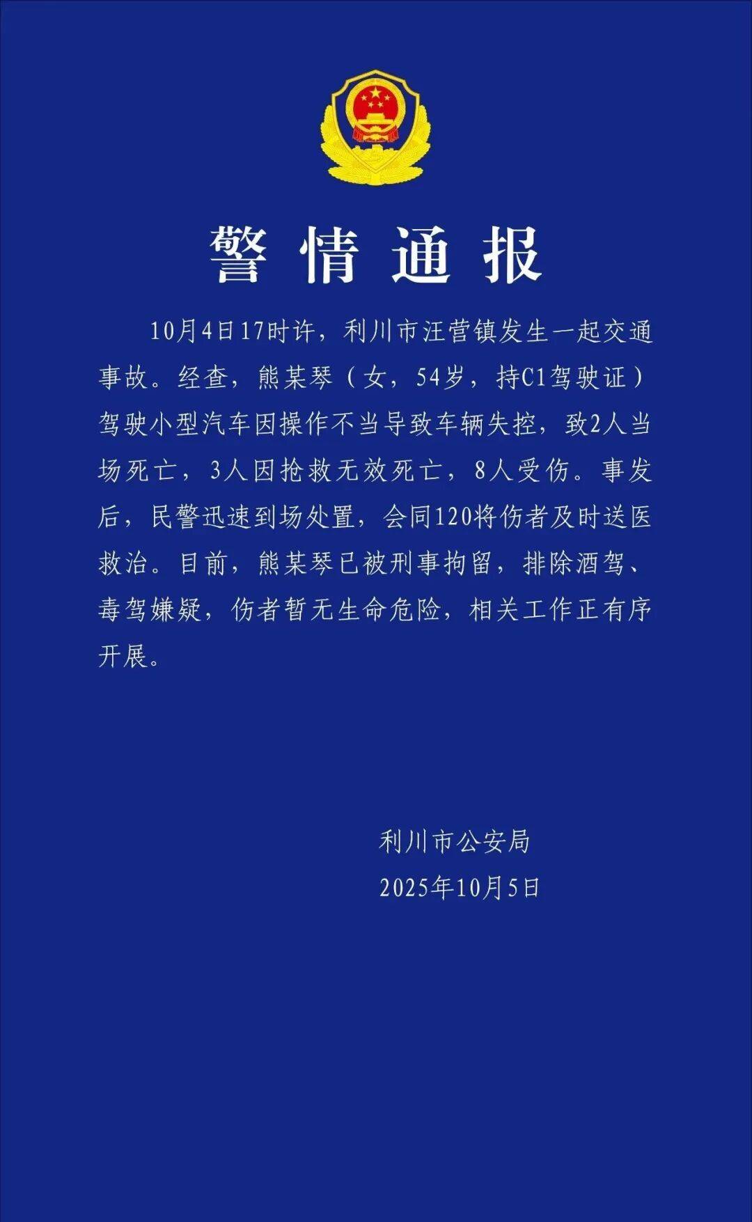 10月4日17时许,利川市汪营镇发生一起交通事故。经查,熊某琴(女,54岁,持C1驾驶证)驾驶小型汽车因操作不当导致车辆失控,致2人当场死亡,3人因抢救无效死亡,8人受伤。