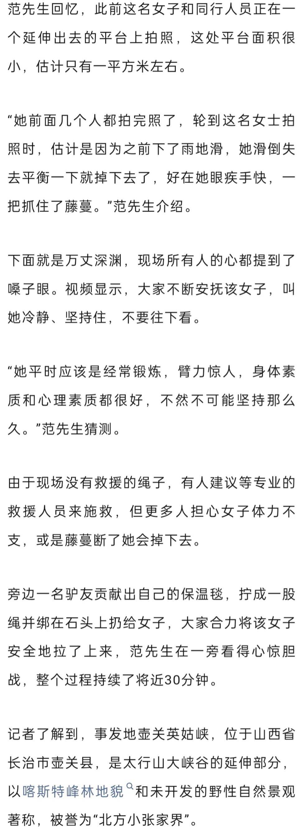 10月4日早上9点多,游客范先生正在山西省长治市英姑峡游玩。他在观景台拍照时,突然一阵尖叫声打破了宁静,一中年女子挂在峭壁上,死死抓着崖壁上的藤蔓呼救,周围人慌作一团。