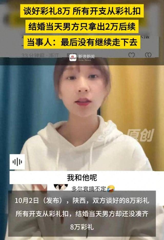 10月2日(发布),陕西,双方谈好的8万彩礼所有开支从彩礼扣,结婚当天男方却还没凑齐8万彩礼。当事人再发视频回应此事,最终没有继续走下去,没有勇气,因为看不到未来。(新浪新闻)