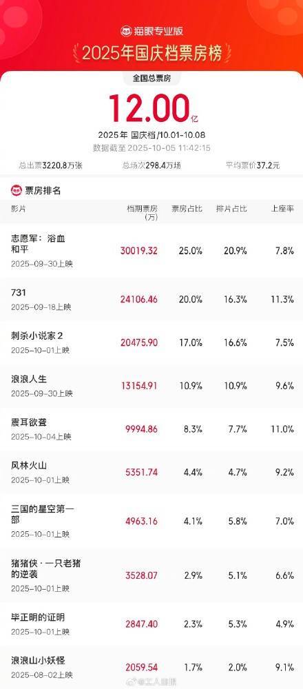 据猫眼专业版数据,截至10月5日11时42分,2025年国庆档档期票房破12亿,《志愿军:浴血和平》《731》《刺杀小说家2》分列前三位。
