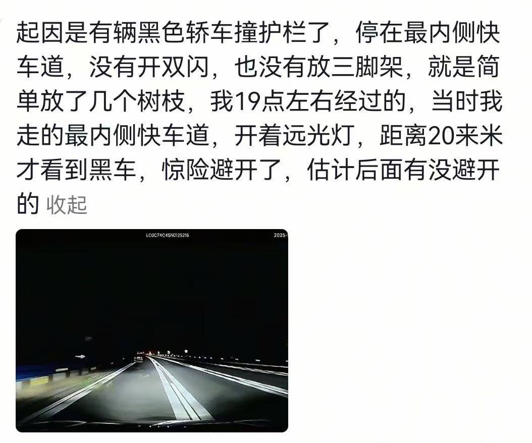 记者另注意到,有一名车主发布自己的行车仪截图,显示是19时27分许经过事发路段,看到靠左第一条车道停放有一辆黑车,该车主称“前面有一辆车出事故撞栏杆了,没放三角警示牌。黑色的,后面的车看不到很容易撞上,因为我刚刚从那里避开,后面的车可能避不开追上了。”记者私信该车主但未获回复。