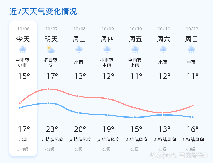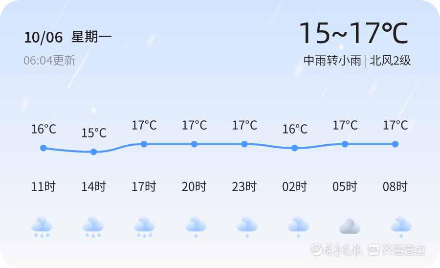 今天是10月6日,农历八月十五,聊城迎来中雨天气,气温在15℃至17℃之间。全市范围内普遍出现中雨转小雨的天气状况,风力较小,北风2级,空气湿度高达96%,PM2.5指数为19,空气质量优良。