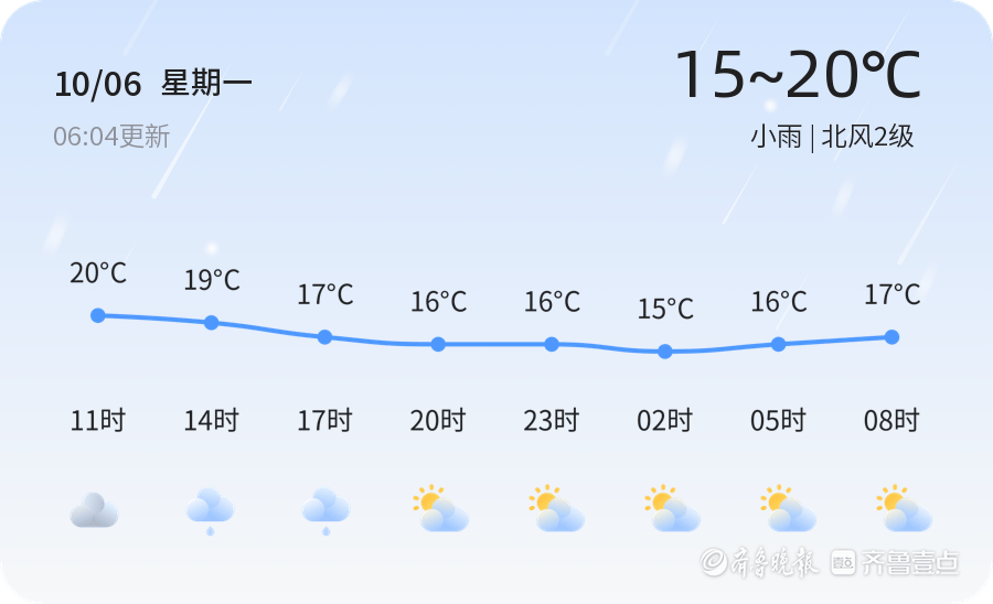 今天是10月6日,农历八月十五,菏泽市迎来小雨天气。全市范围内普遍有小雨,气温在15℃至20℃之间,北风2级,空气湿度高达96%,PM2.5指数为16,空气质量优良。市民们在享受中秋佳节的同时,也要注意防范阴雨天气带来的不便。