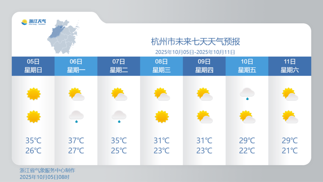 10月6日至7日,浙江省高温的强度、持续时间、偏晚程度均同期少见甚至破纪录。浙江省会杭州10月5日最高气温36.0℃,打破历史最晚高温日纪录。不过,这个最新纪录,还将继续被刷新。