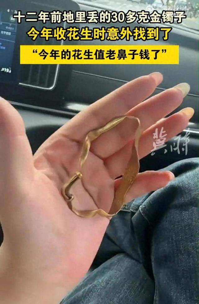 10月5日(报道时间),河北唐山。女子称姥姥十二年前地里丢的30多克金镯子,今年收花生意外找到了。“大概2013年的时候,姥姥帮我们家收花生,镯子就丢到花生地里了,后来地给了亲戚种,亲戚就找到了!”(齐鲁晚报、纵览新闻)
