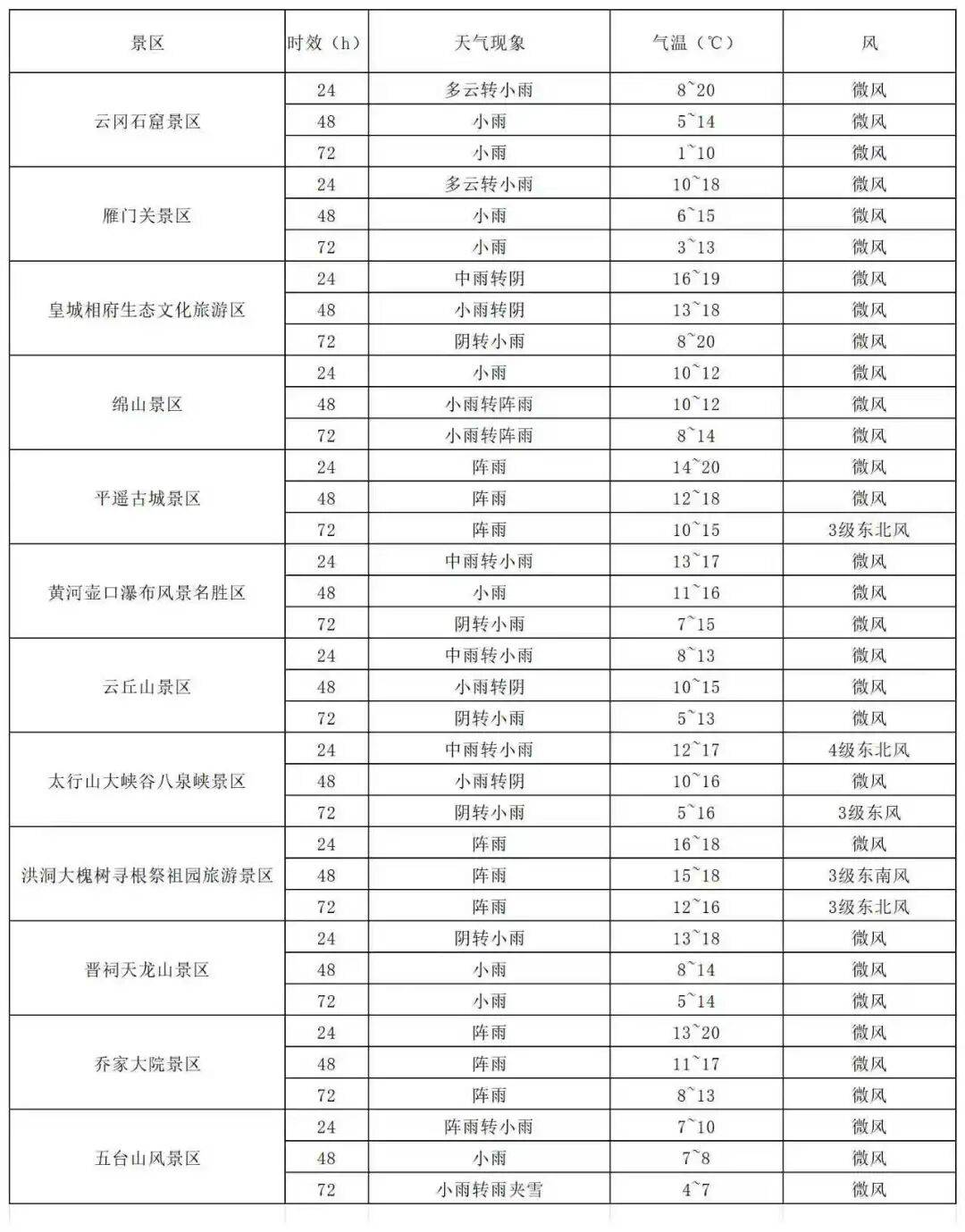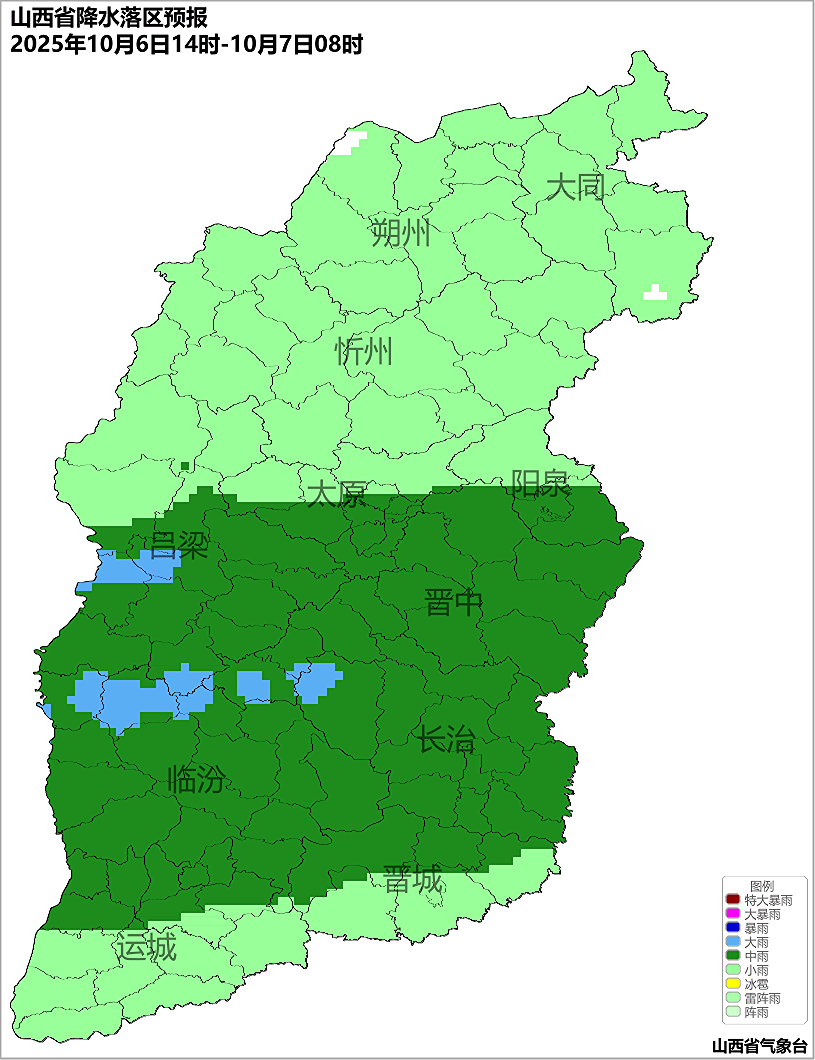 全省阴天,有小雨,北中部大部分地区有中到大雨,大同、朔州、忻州、吕梁等地的局部地区有暴雨;北部局部和中南部部分地区有雾或轻雾。