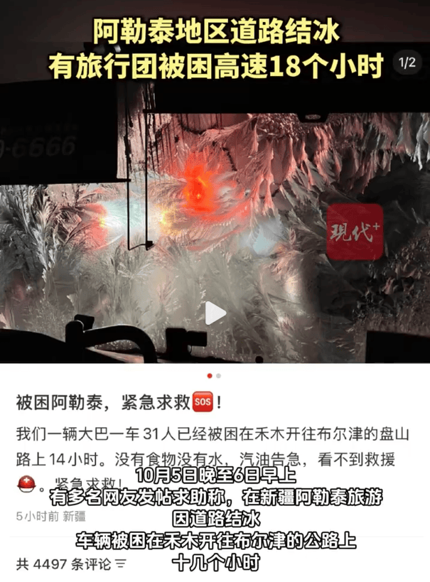10月5日晚至6日早上,有多名网友发帖求助称,在新疆阿勒泰旅游,因道路结冰,车辆被困在禾木开往布尔津的公路上十几个小时。