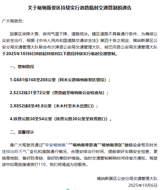10月6日上午8点,喀纳斯景区公安分局交通管理大队发布通告,因景区突降大雪,夜间气温下降,道路结冰。辖区道路不具备通行条件,对部分路段实行临时交通管制。