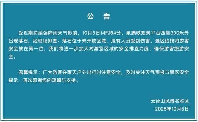 5日晚间,云台山景区发布公告表示,受近期持续强降雨天气影响,10月5日14时54分,泉瀑峡观景平台西侧300米外出现落石,经现场排查:落石位于未开放区域,没有人员受到伤害。景区始终将游客安全放在第一位,将进一步加大对游览区域的安全排查力度,确保游客旅游安全。