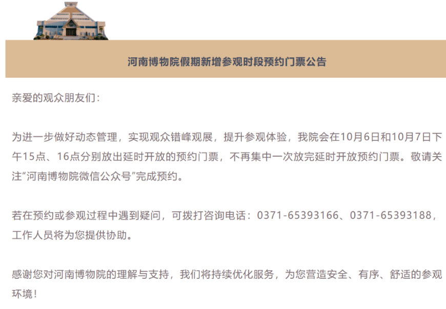 10月6日,河南博物院发布门票预约动态管理的公告,将在10月7日下午15点、16点分别放出延时开放的预约门票,不再集中一次放完延时开放预约门票。