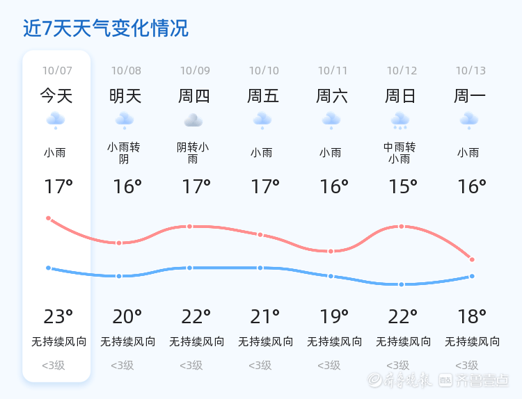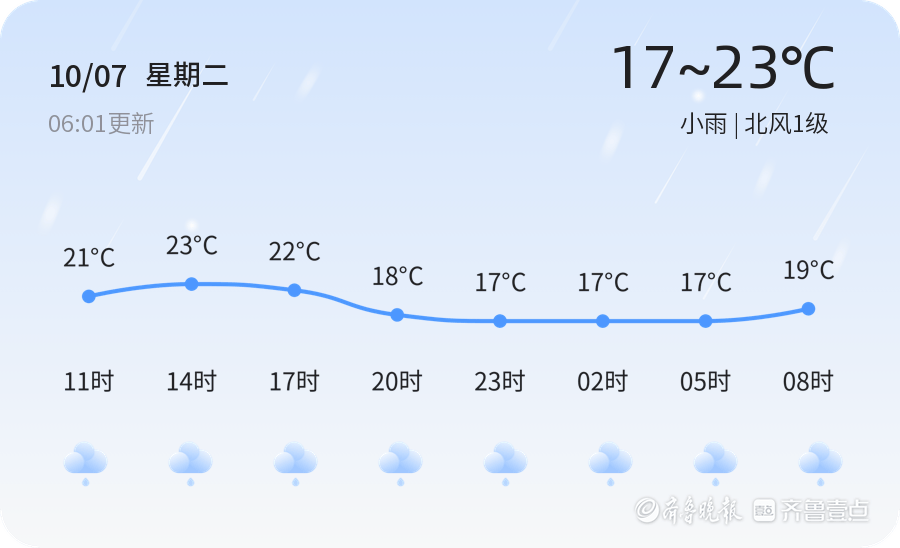 今天是10月7日,星期二,农历八月十六。淄博市今天以小雨天气为主,气温在17℃至23℃之间,北风1级,空气湿度高达96%,PM2.5指数为36,空气质量良好。各区天气情况基本一致,均为小雨天气,市民出行请注意携带雨具,适时添衣保暖。