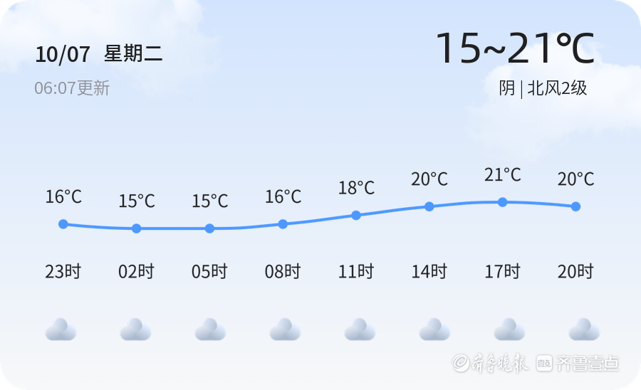 今天是10月7日,农历八月十六,星期二。菏泽市今日天气以阴为主,气温在15℃至21℃之间,湿度较高,达到91%。目前温度为14.3℃,北风2级。空气质量良好,PM2.5指数为35。各区天气情况基本一致,均为阴天,气温和湿度变化不大。