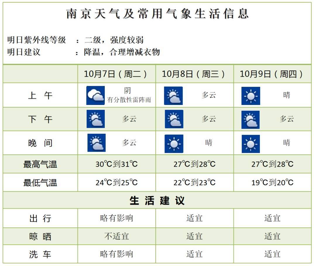 全省晴到多云。最高温度:沿江和苏南地区28~29℃,其他地区26~27℃;最低温度:本省东南部地区21~22℃,其他地区18~19℃。全省偏东风4级左右。