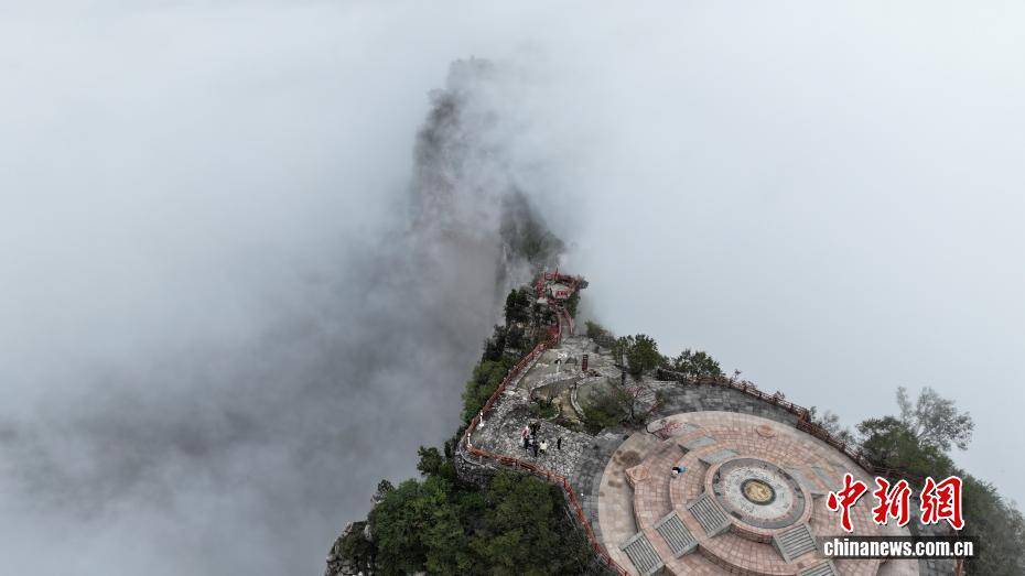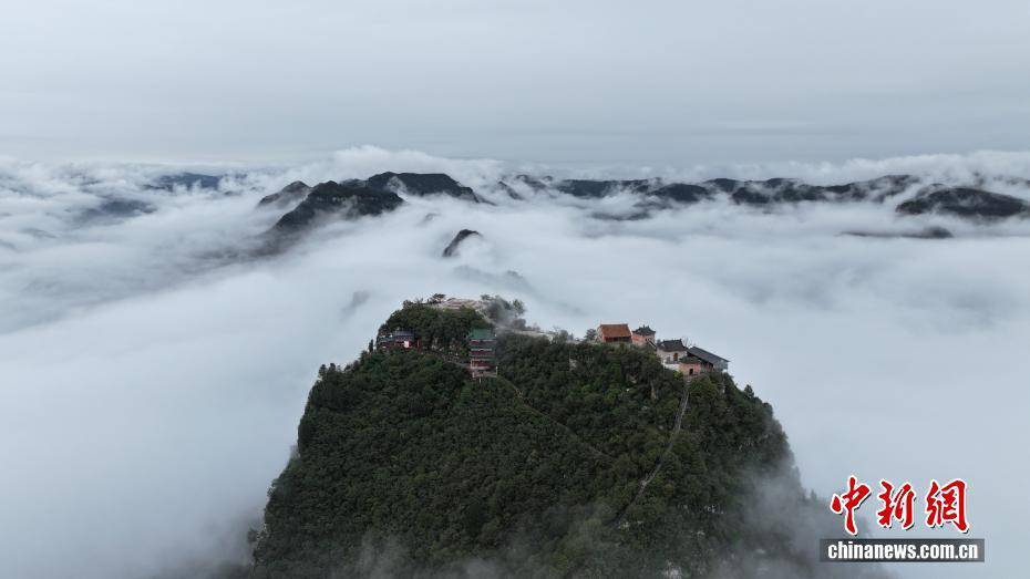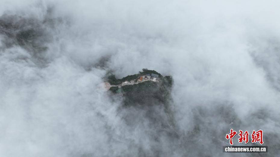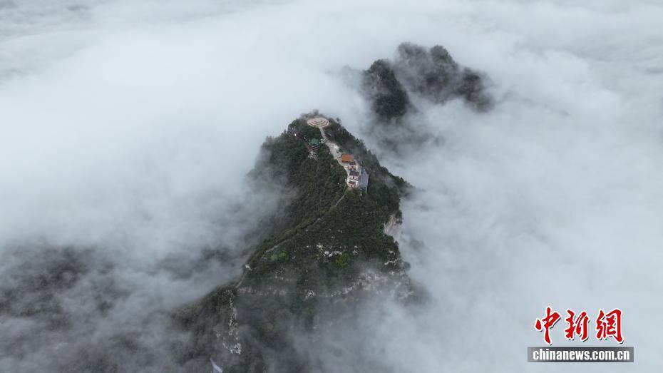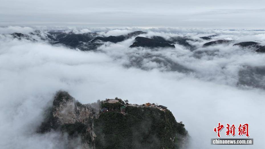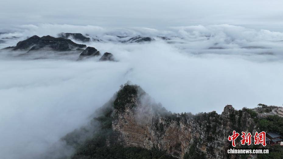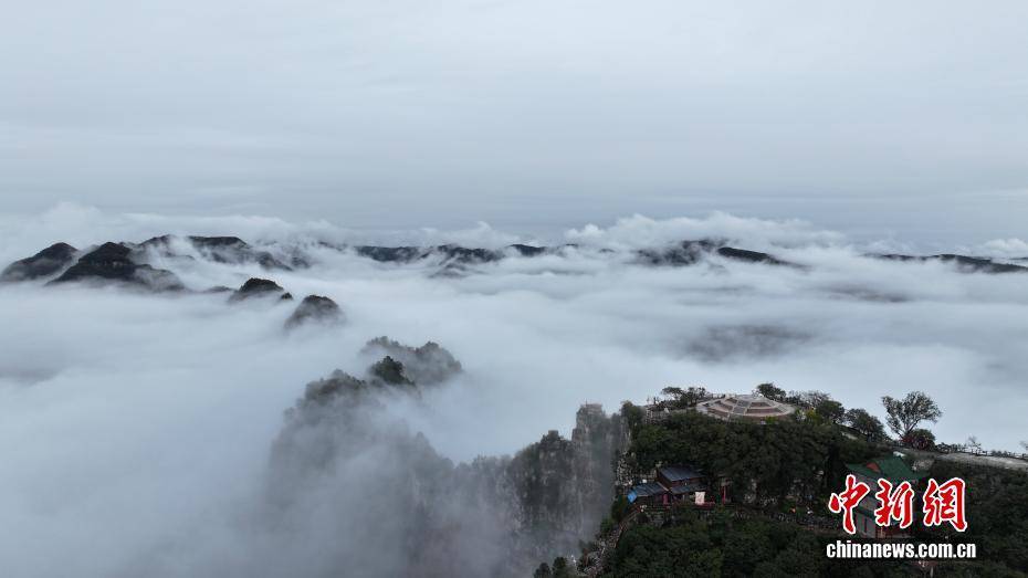 10月6日,河南焦作,连日降雨后的神农山出现云海景观,宛若仙境。图为云海中的神农山紫金顶。(无人机照片)张源杰 摄