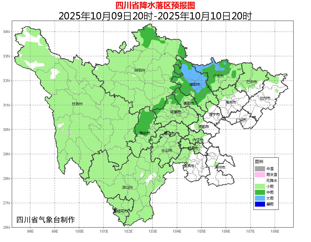 ▲四川省降水落区预报图(10月9日20时-10月10日20时) 图据四川省气象台