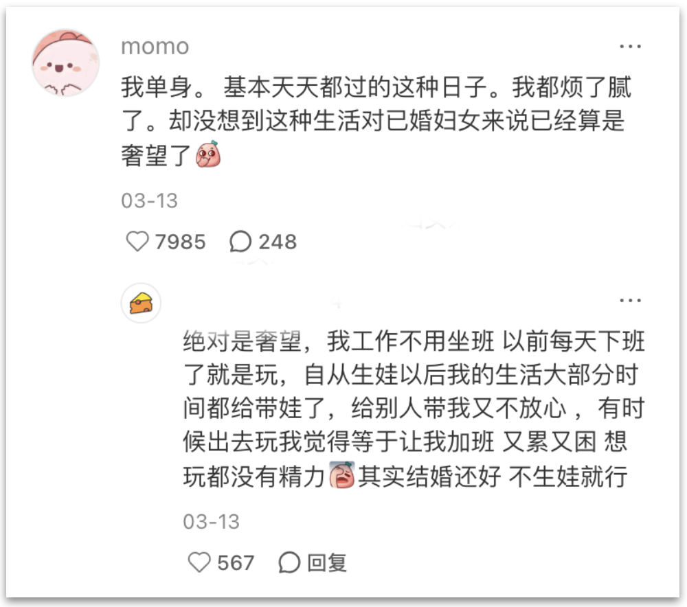一位女性分享了自己的经历:每次在酒店钟点房享受短暂自由时,一想到此刻老人正替自己承担带娃的辛苦,欢愉便瞬间被负罪感冲淡。