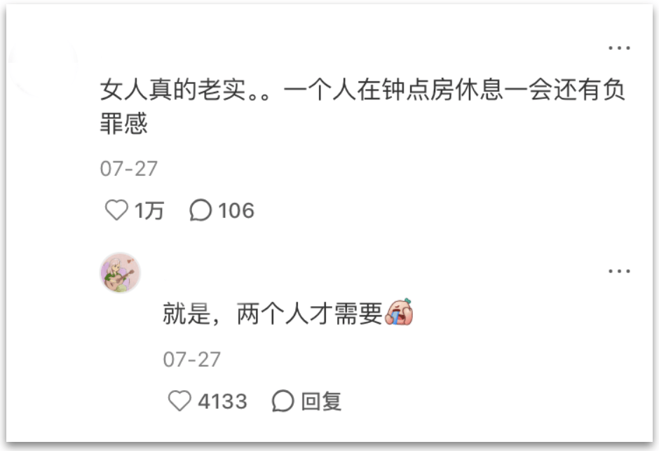 网友感慨:“女人真老实,一个人在钟点房休息一会儿都有负罪感。”