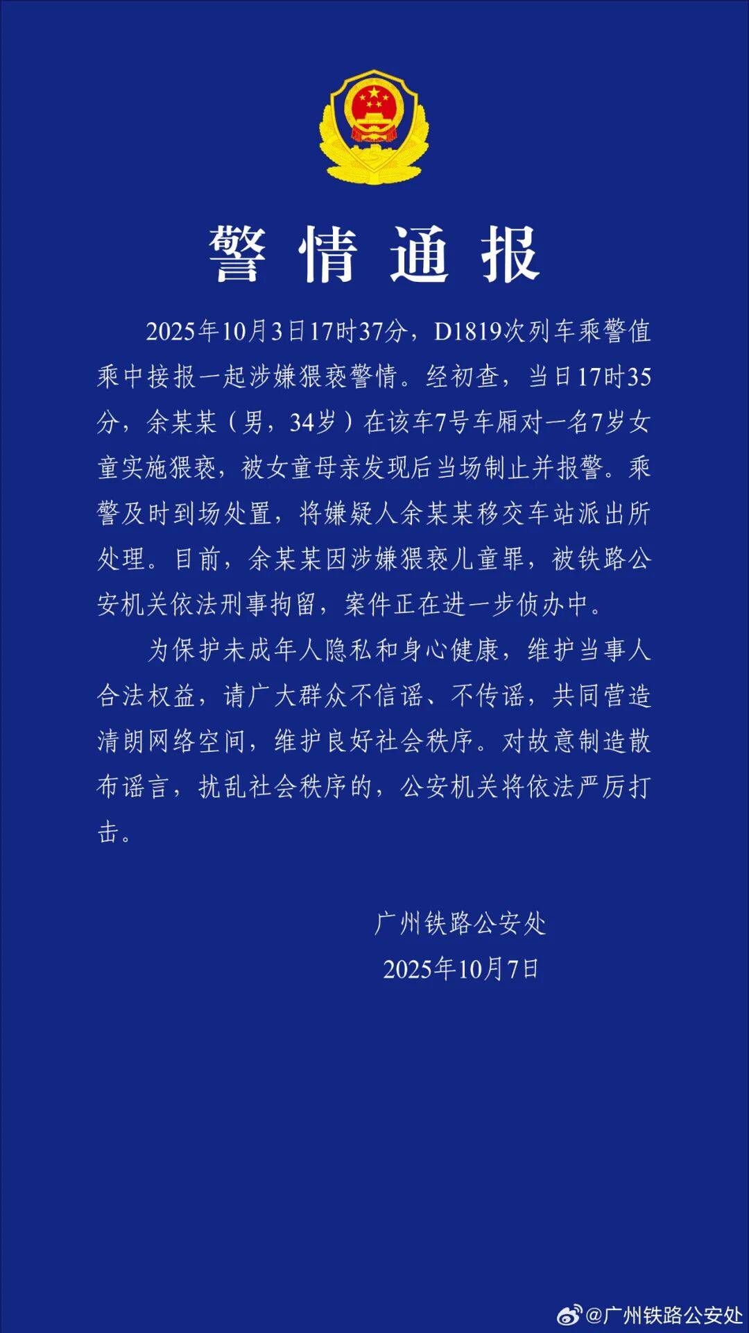 2025年10月3日17时37分,D1819次列车乘警值乘中接报一起涉嫌猥亵警情。经初查,当日17时35分, 余某某(男,34岁)在该车7号车厢对一名7岁女童实施猥亵,被女童母亲发现后当场制止并报警。乘警及时到场处置,将嫌疑人余某某移交车站派出所处理。目前, 余某某因涉嫌猥亵儿童罪,被铁路公安机关依法刑事拘留,案件正在进一步侦办中。