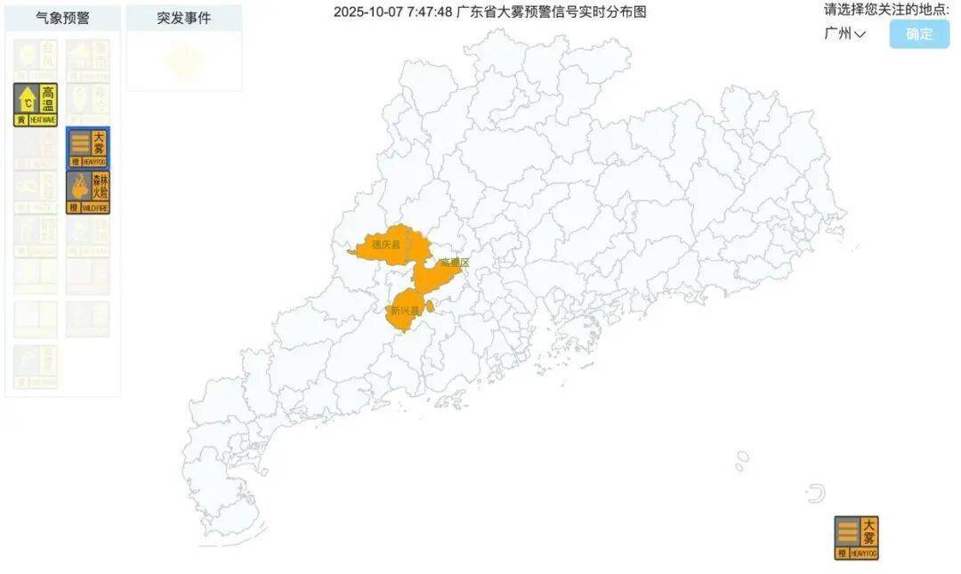 值得注意的是,今早,广东三地出现大雾橙色预警信号。肇庆市德庆县、肇庆市高要区、云浮市新兴县部分地区已出现能见度小于200米的雾且将持续,三地气象台发布大雾橙色预警信号。若回程遇大雾天气,请注意交通安全,应当控制行驶速度,小心驾驶。