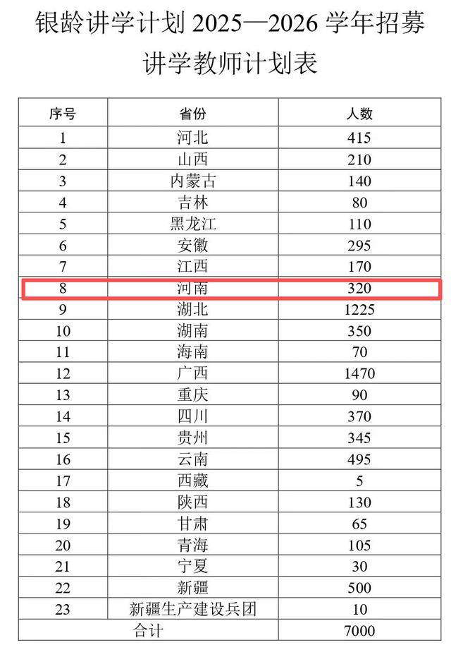近日,教育部、财政部发布关于做好2025年银龄讲学计划有关实施工作的通知,计划在2025年义务教育阶段招募7000名讲学教师,旨在充分利用退休教师专业优势、经验优势,加强新时代乡村教师队伍建设,推动巩固脱贫攻坚成果同乡村振兴有效衔接。其中,河南将招募320名。