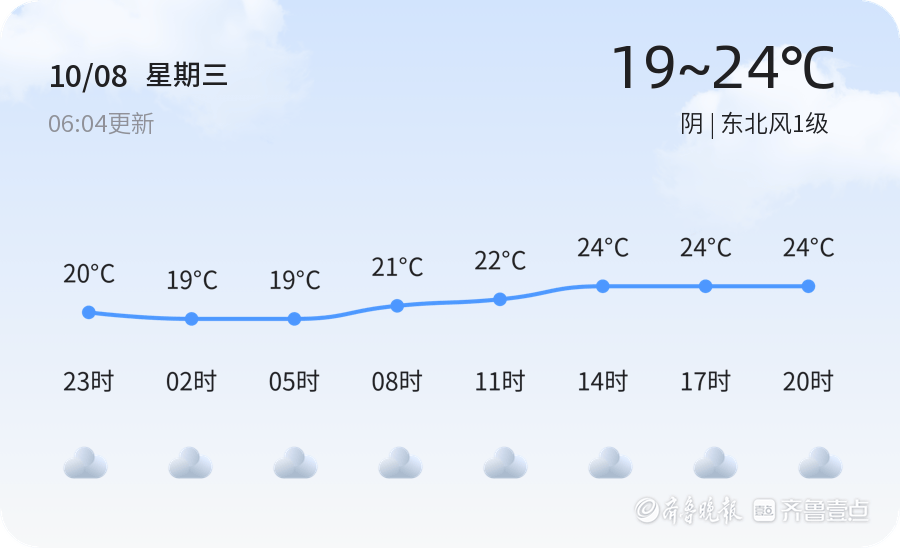 今天是10月8日,农历八月十七,星期三,济宁市迎来寒露节气。寒露是二十四节气之一,标志着天气开始转凉,昼夜温差增大。今日济宁天气以阴天为主,气温在19℃至24℃之间,东北风1级,空气湿度高达95%,PM2.5指数为47,空气质量良好。各区天气情况基本一致,均为阴天,温度适中。