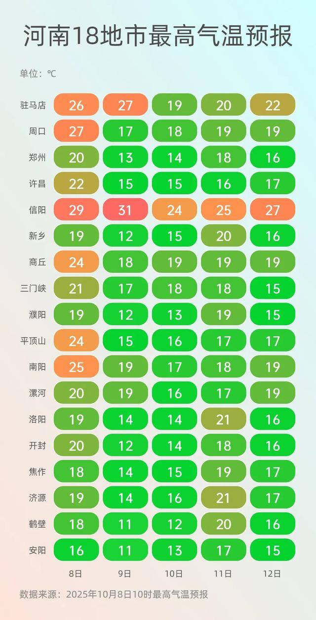 受冷空气扩散影响,今天下午到后天(10日),全省有4级左右的偏北或偏东风,北中部、西部、西南部的部分地区阵风可达7级左右。与此同时,河南大部的气温较前期将下降6℃左右。尤其是淮河以北的大部地区,未来五天的最低气温多在11~13℃,最高气温也不过14~17℃的样子,大家要跟上天气的节奏及时添衣保暖。