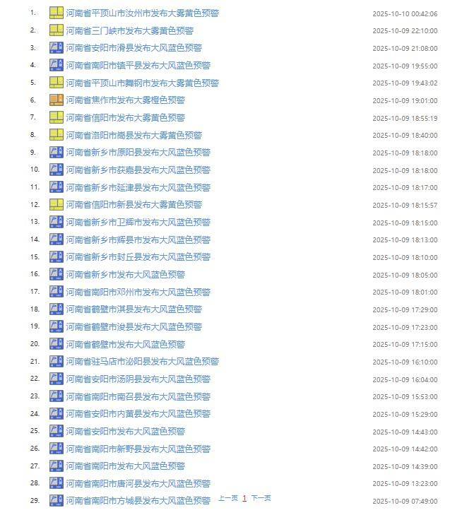 大象新闻记者10月10日从河南气象了解到,今天白天到夜里,淮河以北阴天,大部有小雨或零星小雨;其他县(市、区)多云。全省偏北风4级左右,北中部、西南部阵风6到7级。最高气温:西部、北中部12到14℃;东南部20到22℃;其他县(市、区)14到16℃。最低气温:东部、南部13到15℃;其他县(市、区)10到12℃。截至早上6点45,河南29个大雾、大风等预警信号生效中。