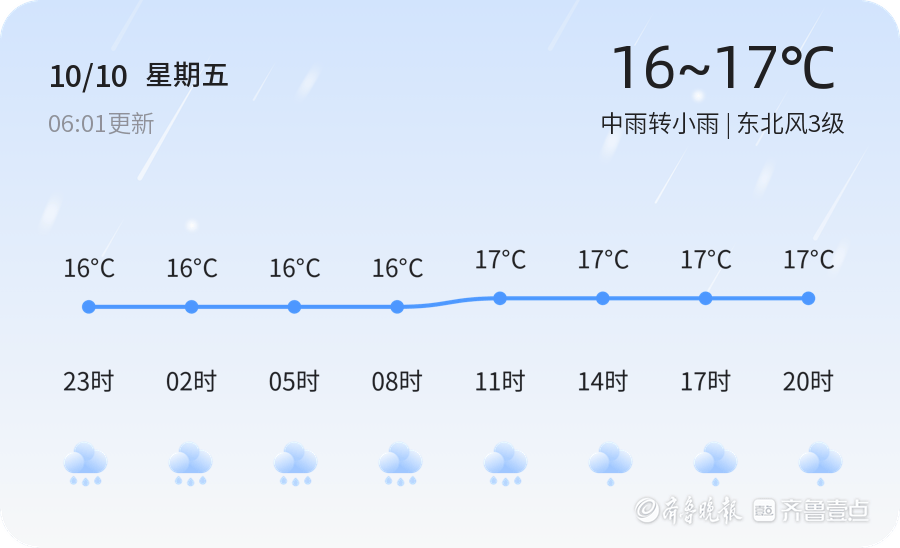 今天是2025年10月10日,星期五,农历八月十九。东营市今天迎来持续降雨天气,预计今天白天到夜间,全市范围内有中雨转小雨,气温在16℃至17℃之间。东北风3级,空气湿度高达98%,PM2.5指数为19,空气质量良好。