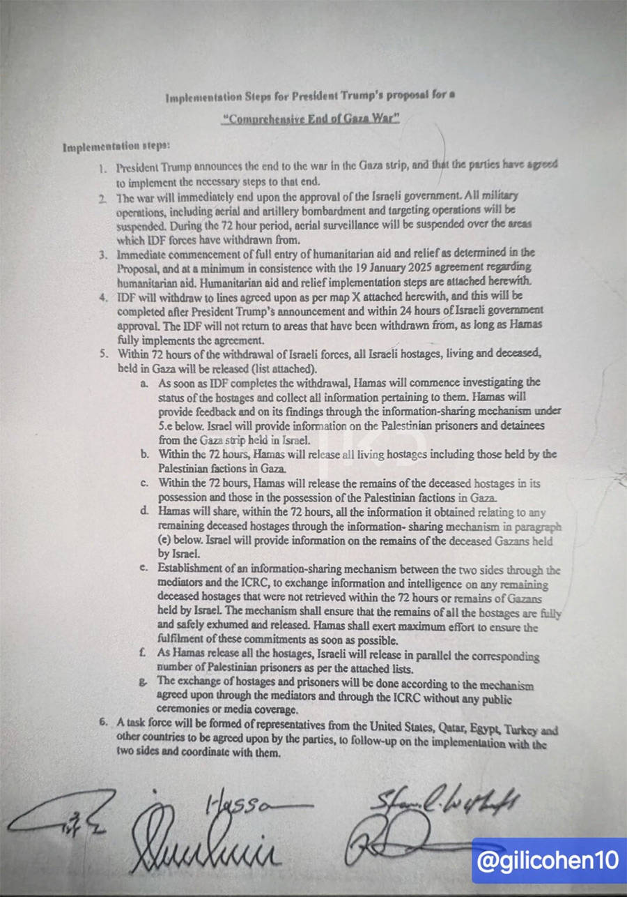 据《以色列时报》报道,当地时间9日夜间,以色列公共广播公司Kan发布了以色列、哈马斯和调解员在埃及签署的释放被扣押人员和结束加沙冲突的协议副本。