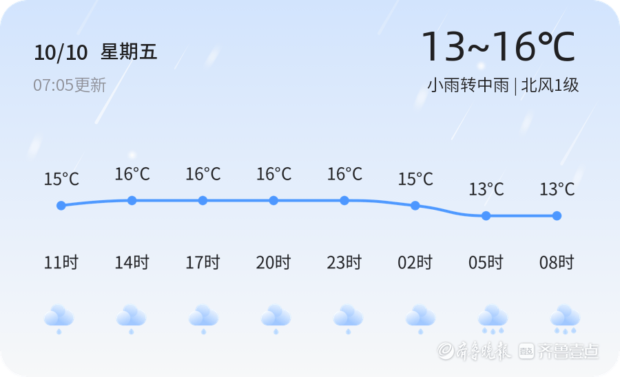 今日是2025年10月10日,农历八月十九,星期五。济南市今天迎来了一轮持续的阴雨天气,气温在13℃至16℃之间,整体湿度较大。早晨7点,济南市大部分地区已开始出现小雨,预计白天将逐渐转为中雨,北风1级,空气湿度高达98%。各区的天气情况基本一致,市民需注意防寒保暖,携带雨具出行。PM2.5指数为11,空气质量良好。
