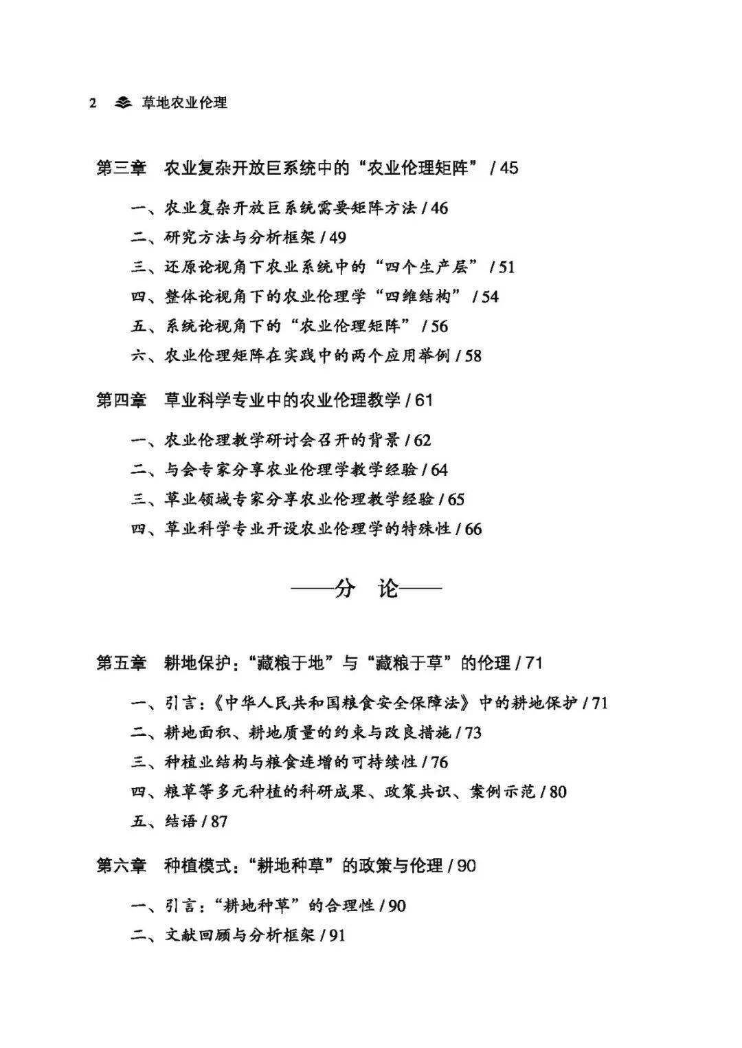 其一,填补农业伦理细分领域研究空白,完善学科体系。农业伦理作为应用伦理学的重要分支,涵盖种植业、畜牧业、林业、草业、渔业等多个部门的应用伦理研究。当前国内学界已有针对上述细分领域的专项伦理学著作,但在“草业伦理”这一关键领域,缺乏系统性、专门化的著述支撑。该书以草业科学与农业伦理的交叉融合为核心视角,系统构建草业伦理研究框架,不仅填补了这一领域的学术空白,更为农业伦理学科体系的完善提供了重要补充,推动草业领域的伦理研究从零散探索走向系统深化。