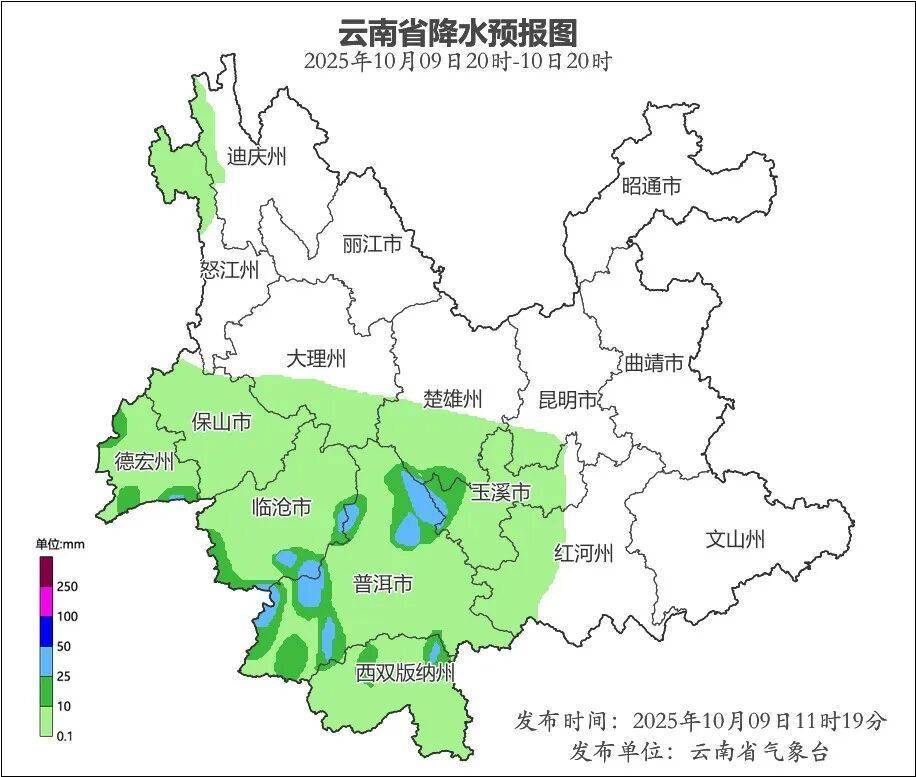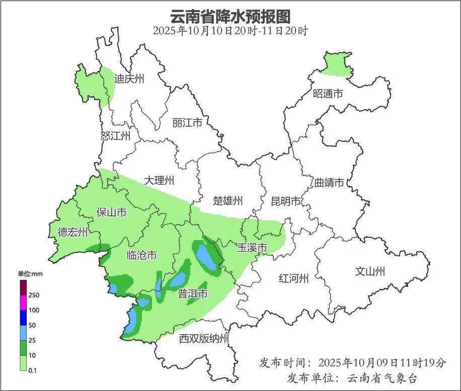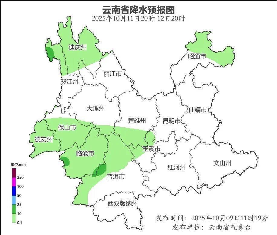10月10日20时到10月11日20时:临沧市西部、普洱市西部和北部多云间阴有小到中雨局部大雨,怒江州北部、迪庆州北部、德宏州、保山市、大理州南部、楚雄州南部、昆明市南部、玉溪市、昭通市北部多云有阵雨局部中雨,其他地区晴间多云。