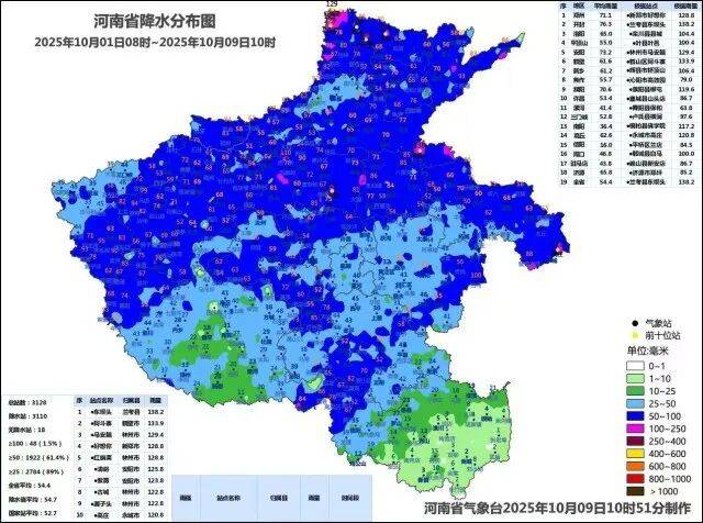 累计雨量大、影响范围广。9月16日以来,河南全省平均降水量221.4毫米,较常年同期偏多3.5倍,为1961年以来同期最多值。10月1日8时至9日10时,河南全省平均降水量54.4毫米,有13个地市平均降水量在50毫米以上,其中前三为开封76.3毫米、安阳73.2毫米、郑州71.1毫米。