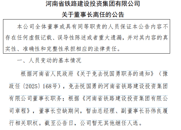 【大河财立方消息】10月10日,河南省铁路建设投资集团有限公司称,根据河南省人民政府《关于免去悦国勇职务的通知》,免去悦国勇的公司董事长职务;根据相关章程,董事长空缺期间,暂由总经理、副董事长孙伟良履行相关职权。截至公告日,公司暂无其他继任人选。