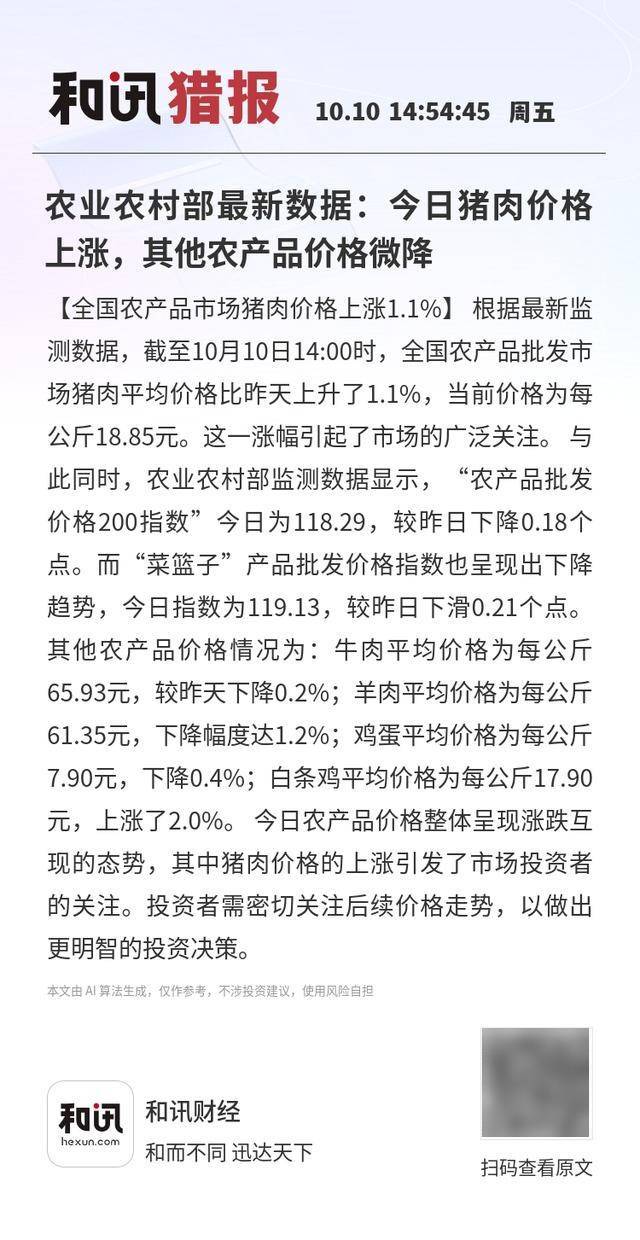 【全国农产品市场猪肉价格上涨1.1%】根据最新监测数据,截至10月10日14:00时,全国农产品批发市场猪肉平均价格比昨天上升了1.1%,当前价格为每公斤18.85元。这一涨幅引起了市场的广泛关注。与此同时,农业农村部监测数据显示,“农产品批发价格200指数”今日为118.29,较昨日下降0.18个点。而“菜篮子”产品批发价格指数也呈现出下降趋势,今日指数为119.13,较昨日下滑0.21个点。其他农产品价格情况为:牛肉平均价格为每公斤65.93元,较昨天下降0.2%;羊肉平均价格为每公斤61.35元,下降幅度达1.2%;鸡蛋平均价格为每公斤7.90元,下降0.4%;白条鸡平均价格为每公斤17.90元,上涨了2.0%。今日农产品价格整体呈现涨跌互现的态势,其中猪肉价格的上涨引发了市场投资者的关注。投资者需密切关注后续价格走势,以做出更明智的投资决策。
