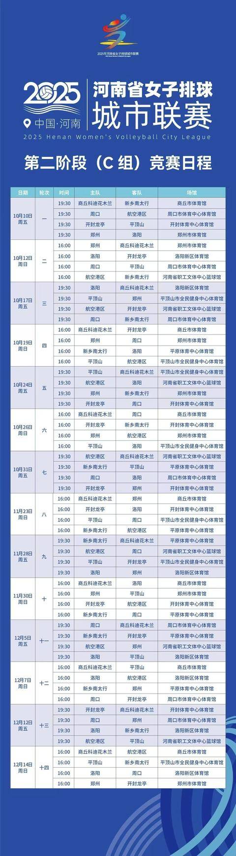 第二阶段赛事排位赛,于10月10日开启,将持续到12月中旬,采用主客场制进行14轮比拼,积分前四名队伍晋级总决赛。这一赛制将进一步扩大赛事覆盖面,在更多城市点燃排球热情。比赛期间,我省各举办地也将同步推出文旅活动与惠民政策,持续打造“看比赛、游河南、品文化”的丰富参与体验。
