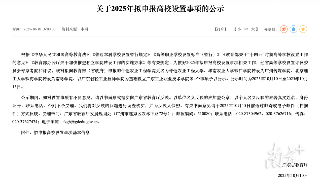 10月10日,广东省教育厅公示,仲恺农业工程学院拟更名为仲恺农业工程大学。公示时间为2025年10月10日至2025年10月15日。这意味着,仲恺农业工程学院“改大”有了新进展。