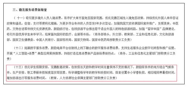 9月16日,商务部等九部门发布《关于扩大服务消费的若干政策措施》。其中指出,优化学生假期安排,完善配套政策。在放假总天数和教学时间总量保持不变的情况下,鼓励有条件的地方结合气候条件、生产安排、职工带薪休假制度落实等因素,科学调整每学年的教学和放假时间,探索设置中小学春秋假,相应缩短寒暑假时间,增加旅游出行等服务消费时间。