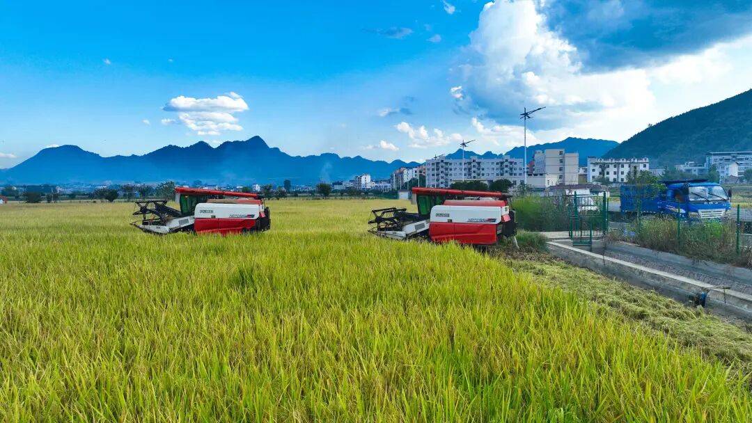 金秋时节,旺草镇晨光村高标准农田里,金黄的稻穗压弯了腰,联合收割机驰骋田间,一派繁忙景象。