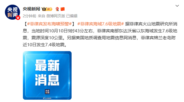 据菲律宾火山地震研究所消息,当地时间10月10日9时43分左右, 菲律宾南部东达沃省以东海域发生7.6级地震,震源深度10公里。 菲律宾发布 海啸预警。