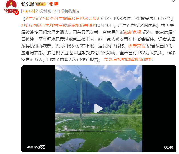 10月10日,广西百色多名网民称,村内房屋被淹多日积水仍未退去。田东县巴立村一名村民告诉新京报记者,她家房屋1日被淹,至今积水已漫过她家二楼半米,她一家人被安置在村委会暂住。记者从田东县防汛办获悉,巴立村积水仍在上涨,居民均已转移。新京报记者从百色市应急局获悉,多地积水迟迟未退系受多轮台风影响,全市已有16.8万人受灾,转移安置近万人,目前全市暂无人员伤亡报告。