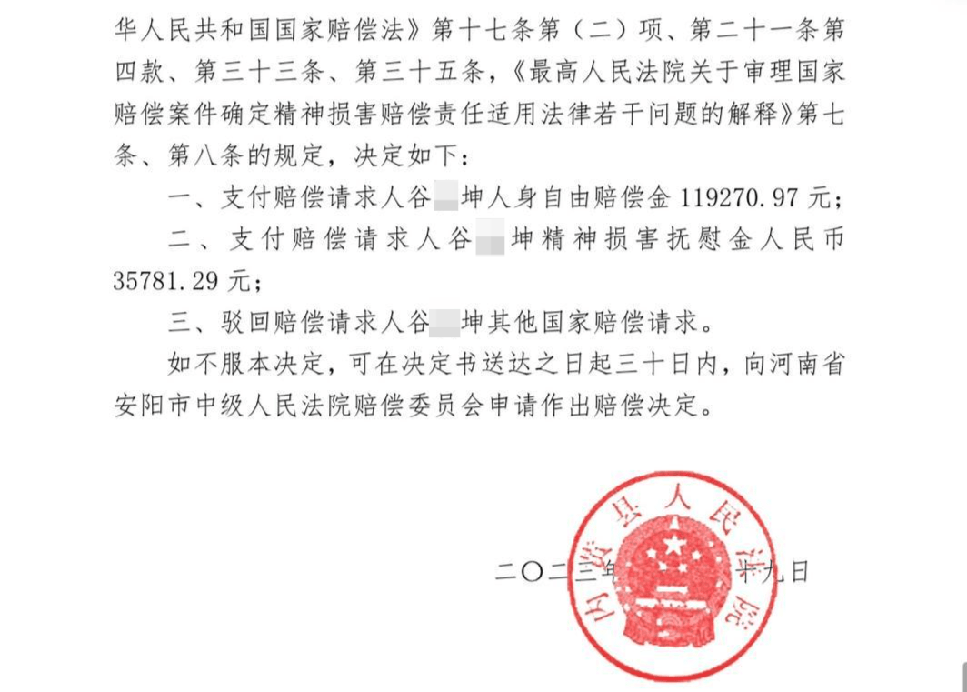 谷先生提供的河南省内黄县人民法院国家赔偿决定书显示,经法院审查查明,谷先生自2021年2月24日被刑事拘留直至2021年11月23日被取保候审,期间共计被关押273天。2023年11月6日,谷先生以重审无罪为由向本院申请国家赔偿。