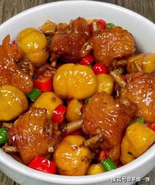 7. 把板栗倒进去,继续焖10分钟,栗子甜味慢慢渗进汤汁,鸡肉也吸饱栗香。