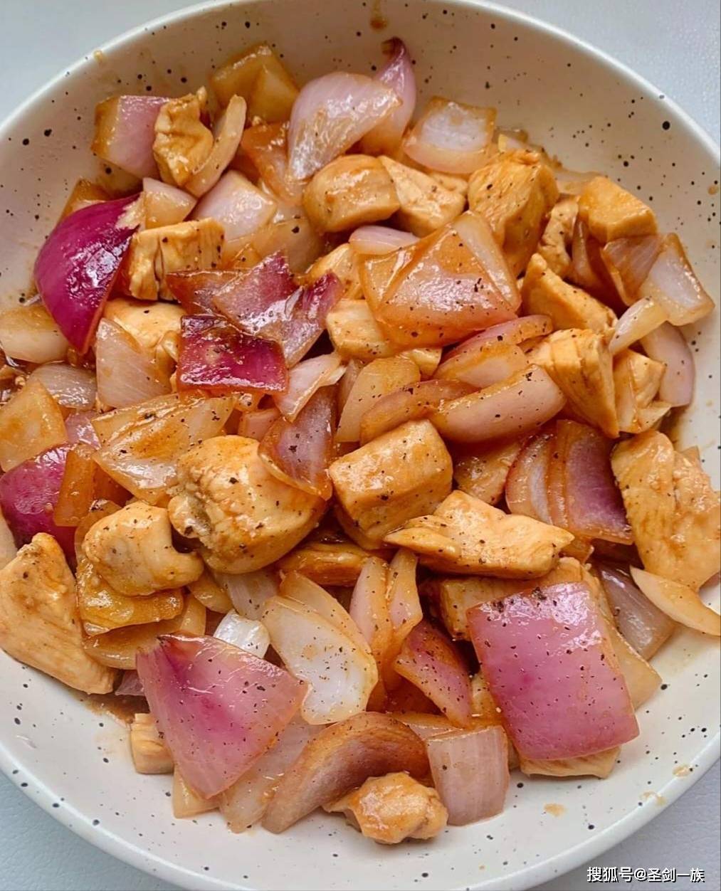 1、洋葱、鸡胸肉切块,鸡胸肉放入1勺生抽、1勺蚝油、1勺料酒、1勺淀粉搅拌腌制5分钟。